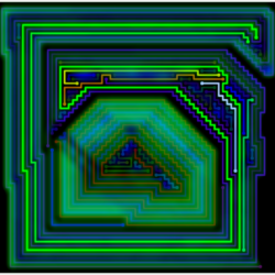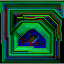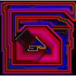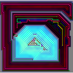The map for this level was generated against levels from the 5th template – the cyan line is pink and very blurry for it’s first pass around the middle layer before breaking off to form the “middle passageway” and the house layer.