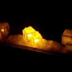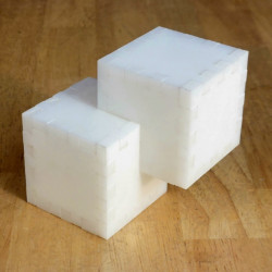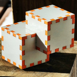 A golden oak stained wooden Relativity Box consisting of two 2-inch cubes that overlap with a 1-inch cube intersection.