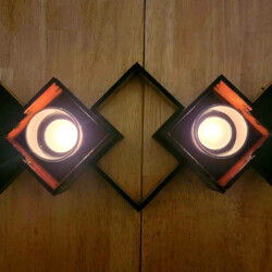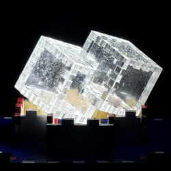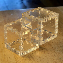 A golden oak stained wooden Relativity Box consisting of two 2-inch cubes that overlap with a 1-inch cube intersection.