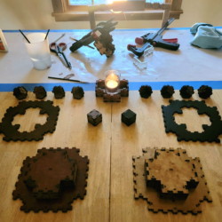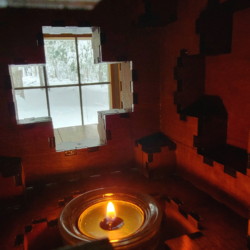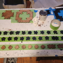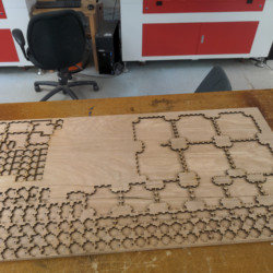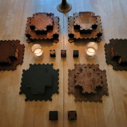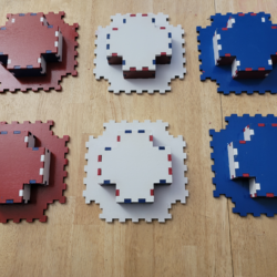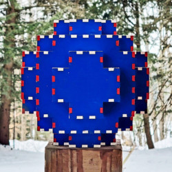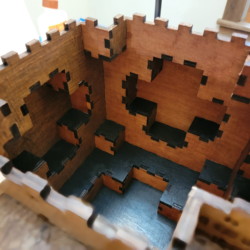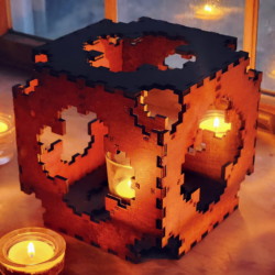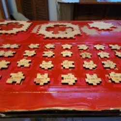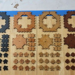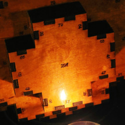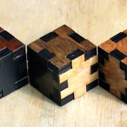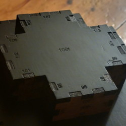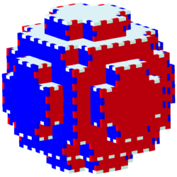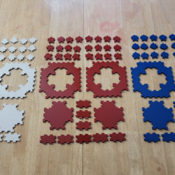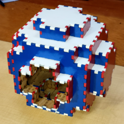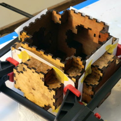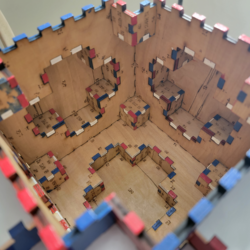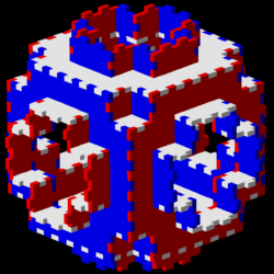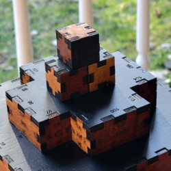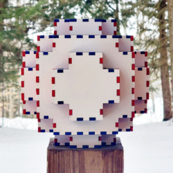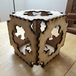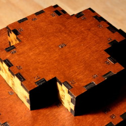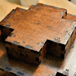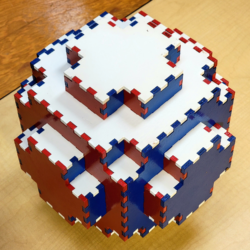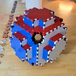 This is the 2nd box that I created as part of the Decorative Box Project. First my program created an 108 sided orthogonal polyhedron that approximates the shape of a sphere. Then it added finger joints to the sides so that they fit together. Next it created instructions for a CNC laser machine to cut out the pieces along with labels to aid with assembly. I then painted the pieces red, white and blue, and assembled them into the first sphere box above.