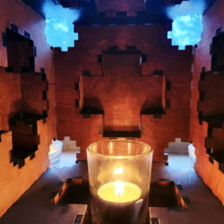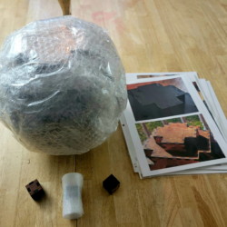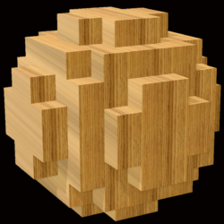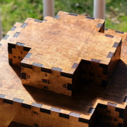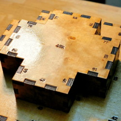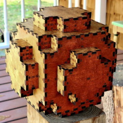 A 108-sided wooden box that approximates the shape of a sphere, with labels on the outside to demonstrate the software and assembly.