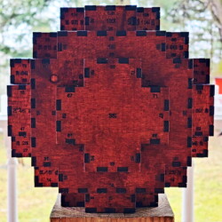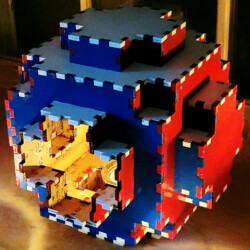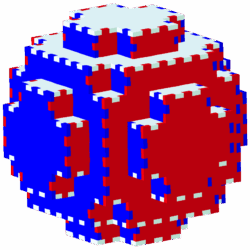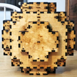 This is the 2nd box that I created as part of the Decorative Box Project. First my program created an 108 sided orthogonal polyhedron that approximates the shape of a sphere. Then it added finger joints to the sides so that they fit together. Next it created instructions for a CNC laser machine to cut out the pieces along with labels to aid with assembly. I then painted the pieces red, white and blue, and assembled them into the first sphere box above.