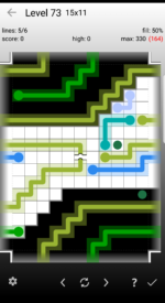In The River, the differences between the levels of each of the 30 designs are subtle. You will see some common patterns in the lines, but they are rarely obvious. The levels are hard, but not unfair if you are willing to use hint mode at times.
